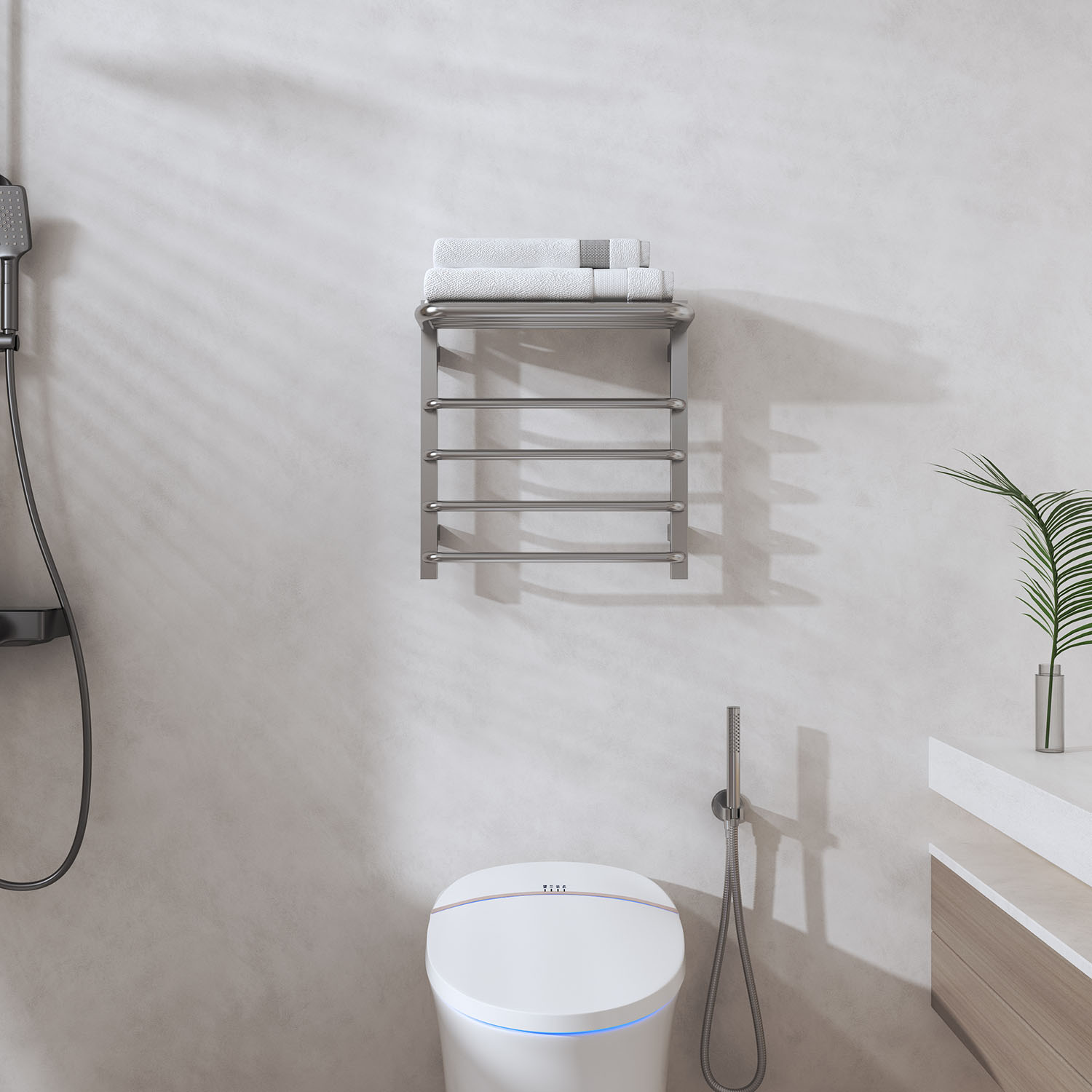 8桿時(shí)控開關(guān)電熱毛巾架 8 bar time switch heated towel rail 材質(zhì)Material:SS201/SS304 功率Power:220V/95W 表面Surface:Mirror Polished 鏡面拋光 尺寸Size:480*250*500mm 包裝Ctn size:500*270*530mm