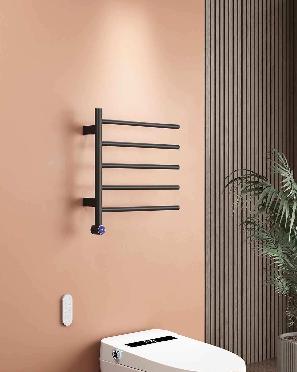 5桿液顯旋鈕開關電熱毛巾架 5 bar LCD display knob switch heated towel rail 材質Material:SS201/SS304 功率Power:220V/80W 表面Surface:Black Painted 黑色噴塑 尺寸Size:500*110*500mm 包裝Ctn size:520*120*700mm