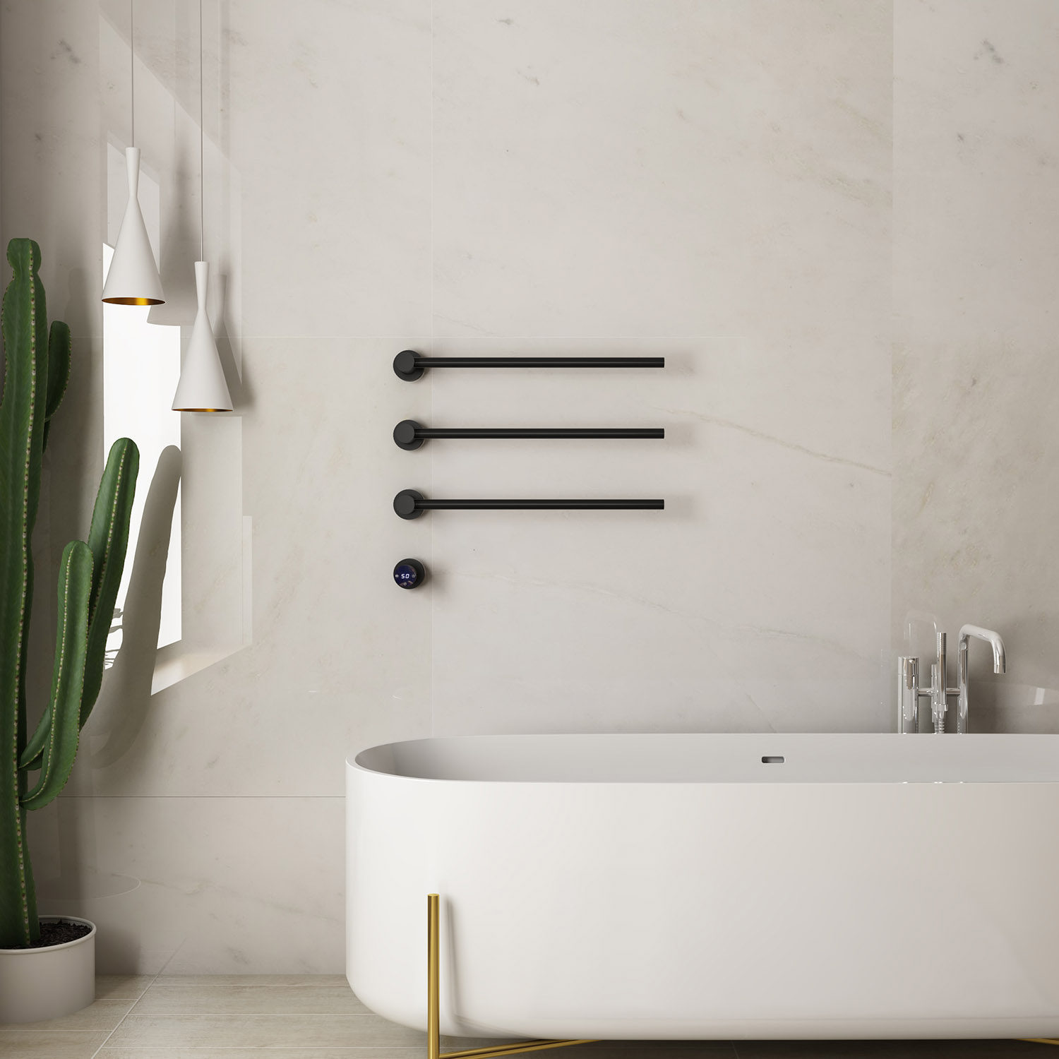 單桿預埋旋鈕開關電熱毛巾架Single lever embedded knob switch heated towel rack材質Material:SS201/SS304功率Power:220V/60W表面Surface:Black Painted 黑色噴塑單桿尺寸Single Rod Size:500*150mm包裝Ctn size:710*110*410mm
