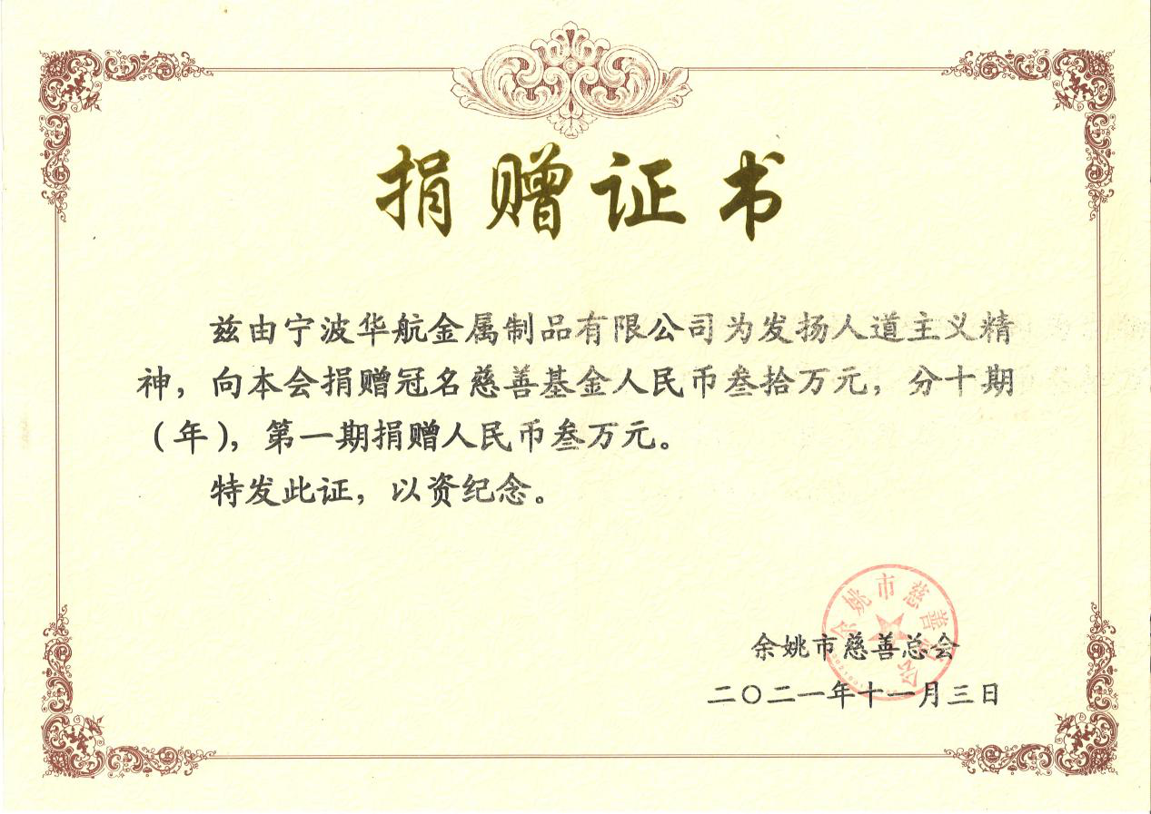 2021年11月3日,寧波華航金屬制品有限公司為了幫助扶貧濟困支持慈善事業,華航公司向余姚市市慈善總會捐贈30萬元,并在余姚市慈善總會設立華航慈善基金,為建設和諧社會盡一份心力。